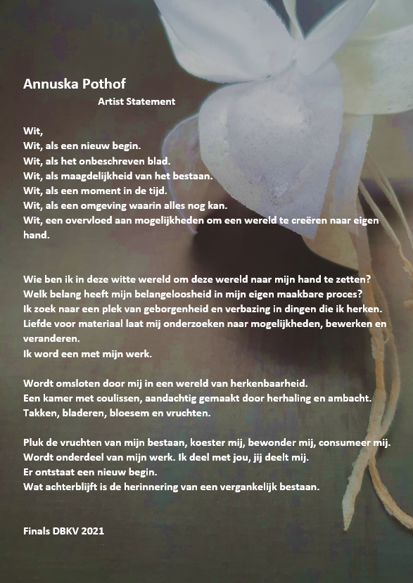 De bezoeker wordt in deze witte kamer uitgenodigd om op een analoge manier aandachtig te kijken naar mijn werk. Zonder afleiding van digitale middelen. Door de kijker uit te nodigen om een stukje van mijn werk te plukken en op te eten wordt deze onderdeel van mijn beeldend werk. Zo evolueert het beeld. Wat achter blijft wordt in herinnering meegenomen.